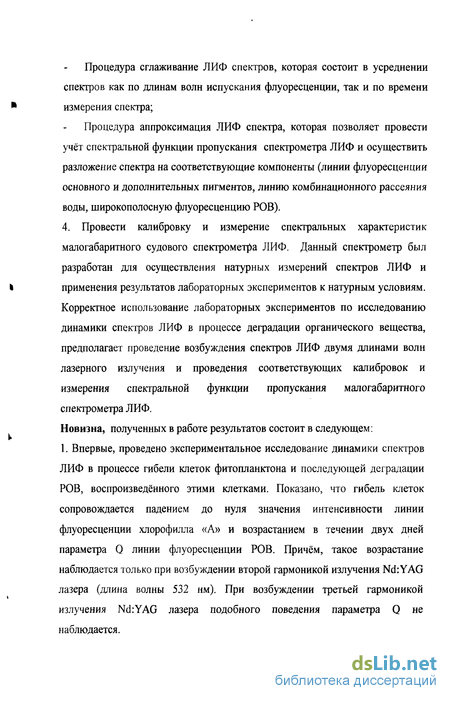 Новизна, полученных в работе результатов состоит в следующем: 1. Впервые, проведено экспериментальное исследование динамики спектров ЛИФ в процессе гибели клеток фитопланктона и последующей деградации РОВ, воспроизведённого этими клетками. Показано, что гибель клеток сопровождается падением до нуля значения интенсивности линии флуоресценции хлорофилла «А» и возрастанием в течении двух дней параметра Q линии флуоресценции РОВ. Причём, такое возрастание наблюдается только при возбуждении второй гармоникой излучения Nd:YAG лазера (длина волны 532 нм). При возбуждении третьей гармоникой излучения Nd:YAG лазера подобного поведения параметра Q не наблюдается.