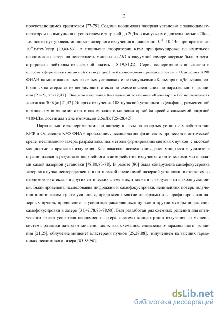 Разработка принципов построения и оптических схем твердотельных лазеров для ЛТС, их элементной базы опирается во многом на результаты исследований физических процессов в оптической среде мощного лазера и методов формирования лазерных пучков. Многие исследования в этом направлении: разработка методов генерации наносекундных (10-7-10-9с) и пикосекундных (10-10-10-12с) импульсов в рубиновых и неодимовых лазерах; исследования распространения этих импульсов в усилителях, дифракции и самофокусировки пучка в оптическом тракте лазерной установки, разрушений в среде лазера и других процессов, ограничивающих мощность и яркость излучения; разработка методов подавления самофокусировки, профилирования лазерных пучков, методов многоканального усиления, транспортировки лазерных пучков к мишени, развязки лазера от мишени были выполнены в ФИАН. Автор принимал участие в исследованиях и разработках, связанных с созданием лазерных установок на неодимовом стекле для экспериментов по нагреву плазмы, проводившихся в лаборатории квантовой радиофизики (КРФ) в 196070-х гг., а затем в Отделении КРФ ФИАН. В последнее время автор принимал также участие в исследованиях новых лазерных материалов на основе кристаллов и керамики, перспективных для применения в лазере-драйвере для ЛТС, в разработке методов формирования инверсии и модового состава излучения в лазерах на керамике Nd:YAG и Yb:YAG с селективной (полупроводниковой, лазерной) накачкой. Эти работы проводились в ФИАН и в Институте лазерной науки (г. Токио, Япония). Результаты исследований автора в указанных направлениях систематизированы в представленной диссертации.