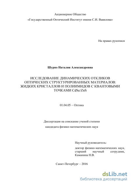 Научная новизна. В настоящей работе проведено комплексное исследование процесса наноструктурирования органических электрооптических материалов: жидких кристаллов и полиимидов полупроводниковыми квантовыми точками CdSe/ZnS и впервые установлено:
