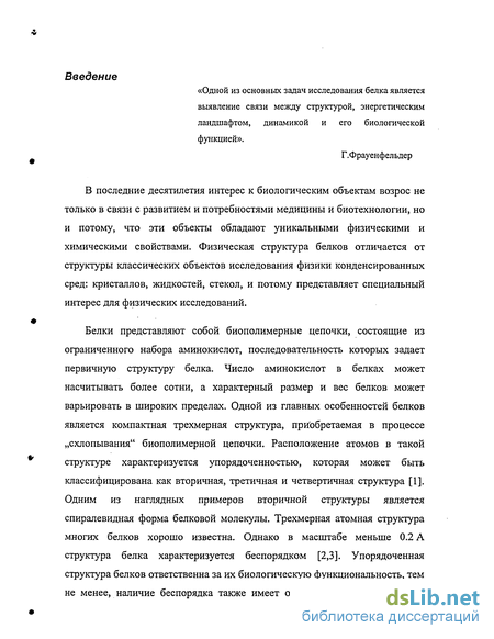 Белки представляют собой биополимерные цепочки, состоящие из ограниченного набора аминокислот, последовательность которых задает первичную структуру белка. Число аминокислот в белках может насчитывать более сотни, а характерный размер и вес белков может варьировать в широких пределах. Одной из главных особенностей белков является компактная трехмерная структура, приобретаемая в процессе „схлопывания" биополимерной цепочки. Расположение атомов в такой структуре характеризуется упорядоченностью, которая может быть классифицирована как вторичная, третичная и четвертичная структура [1]. Одним из наглядных примеров вторичной структуры является спиралевидная форма белковой молекулы. Трехмерная атомная структура многих белков хорошо известна. Однако в масштабе меньше 0.2 А структура белка характеризуется беспорядком [2,3]. Упорядоченная структура белков ответственна за их биологическую функциональность, тем не менее, наличие беспорядка также имеет огромное значение и играет