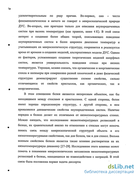 В этом отношении белки являются интересным объектом, как бы находящимся между стеклами и кристаллами. С одной стороны, белок имеет хорошо определенную структуру, с другой стороны, в нем проявляются динамические свойства неупорядоченных систем. Наличие порядка в белках делает их отличными от низкотемпературных стекол. Можно ожидать, что исследование низкотемпературных релаксаций в белках, их сравнительный анализ по отношению к стеклам могут помочь понять связь между микроскопической структурой объекта и его низкотемпературными свойствами, как для белков, так и для стекол. Весьма важным свойством белков является также влияние растворителя на их низкотемпературную динамику [27-29]. Исследование этого влияния может помочь в понимании микроскопических механизмов низкотемпературных релаксаций в белках, находящихся во взаимодействии с матрицей. В этой связи была поставлена первая задача диссертации, а именно: исследование