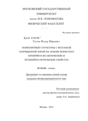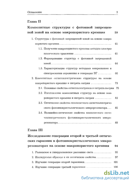Работа имеет следующую структуру: первая глава содержит обзор литературы, касающийся описания свойств структур с фотонной запрещенной зоной и развития методов их изготовления, а также свойств пористого кремния и формирования микроструктур на его основе; вторая глава посвящена разработке фотоннокристаллических структур на основе пористого кремния n-типа, композитных фотоннокристаллических структур на основе пористого кремния n-типа и сегнетоэлектрика нитрита натрия и исследованию их оптических свойств; третья глава посвяіцена исследованию методом спектроскопии второй и третьей оптических гармоник в k-прос транстве фотоннокристаллических структур на основе пористого кремния n-типа и композитных фотоннокристаллических структур на основе пористого кремния n-типа и сегнетоэлектрика нитрита натрия; четвертая глава посвящена разработке фотоннокристаллических микрорезонаторных структур на основе пористого кремния и функционального полимерного материала в качестве микрорезо-наторного слоя, и исследованию их нелинейно-оптических свойств методом z-сканирования.