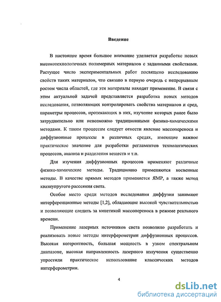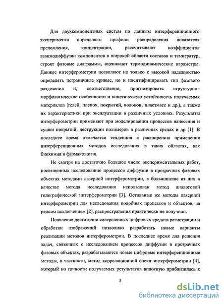 Применение лазерных источников света позволило разработать и реализо-вывать новые методы интерферометрии диффузионных процессов. Высокая когерентность, большая мощность в узком спектральном диапазоне, высокая направленность лазерного излучения существенно упростили практическое использование классических методов интерферометрии и предопределили разработку новых методов интерференционных измерений, диагностики и контроля параметров различных объектов и сред как технического, так и биологического происхождения. Для двухкомпонентных систем по данным интерференционного эксперимента определяют профили распределения показателя преломления, концентрации, рассчитывают коэффициенты взаимодиффузии компонентов в широкой области составов и температур, строят фазовые диаграммы, оценивают термодинамические параметры. Данные интерферометрии позволяют не только с высокой надежностью определять пограничные кривые, но и идентифицировать тип фазового разделения и, соответственно, прогнозировать структурно-морфологические особенности и кинетическую устойчивость получаемых материалов (гелей, пленок, покрытий, волокон, пластмасс и др.), а также их характеристики при эксплуатации в различных условиях. Результаты интерферометрии применяют при моделировании процессов нанесения и сушки покрытий, деструкции полимеров в различных средах и др. В последнее время отмечается тенденция к расширению применения лазерных интерференционных методов исследования в таких областях, как биохимия и фармакология.