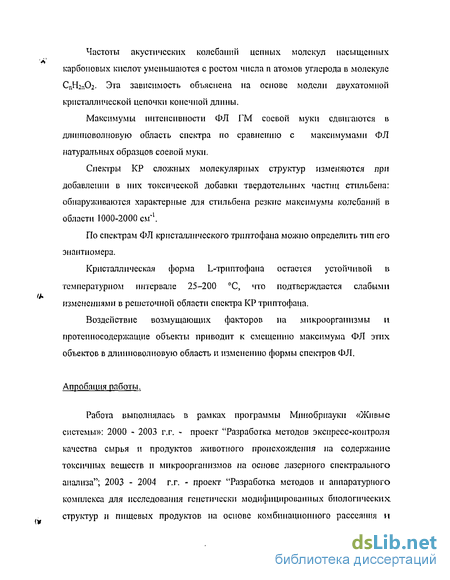 Работа выполнялась в рамках программы Минобрнаукн «Живые системы»: 2000 - 2003 г.г. - проект "Разработка методов экспресс-контроля качества сырья и продуктов животного происхождения на содержание токсичных веществ и микроорганизмов на основе лазерного спектрального анализа"; 2003 - 2004 г.г. - проект "Разработка методов и аппаратурного комплекса для исследования генетически модифицированных биологических структур и пищевых продуктов на основе комбинационного рассеяния и