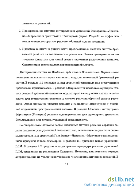 Диссертация состоит из Введения, трёх глав и Заключения. Первая глава посвящена изложению теории связанных мод для волоконной брэгговской решётки. В разделе 1.1 приведён вывод уравнений связанных мод и обсузкдение пределов их применимости. В разделе 1.2 приводится несколько примеров точных решений уравнений связанных мод, которые в следующих главах используются для тестирования численных методов решения обратной задачи рассеяния. Особое внимание уделено решётке с постоянной амплитудой и линейной модуляцией пространственной частоты. В разделе 1.3 описан метод трансфер-матриц (Т-матриц) решения задачи рассеяния для одномерного уравнения Гельмгольца и для системы уравнений связанных мод.