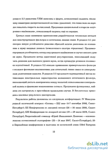 шить N раз. Решение f(x, у) надо найти в N точках по оси у при различных значениях переменной х. Отсюда получается, что непосредственное численное решение требует порядка iV4 операций. При характерных N ~ 104 расчёт представлялся слишком трудоёмким, это заставило исследователей искать более эффективные методы численного решения обратной задачи, основанные на других подходах. Эти методы могут быть разделены на три группы. Первая и наиболее распространённая группа состоит из нескольких модификаций алгоритма послойного восстановления: непрерывного [36] и дискретного [33]. Вторая группа, использующая уравнения ГЛМ, включает различные численные методы. Третья группа использует конечно-разностные схемы для решения нелинейных гиперболических дифференциальных уравнений [37], эквивалентных ГЛМ для достаточно гладких функций, так называемые методы чехарды (leapfrog) [38-41]. Методы первой и третьей групп — очень быстрые, так как требуемое число операций — порядка N2. Однако, они имеют сравнительно низкую точность, особенно при высоком отражении, поскольку профиль ВБР аппроксимируется кусочно-постоянной функцией [42].