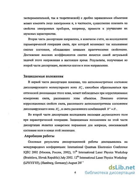 В первой части диссертации показано, что антисимметричное состояние диссоциирующего молекулярного иона tfj, способное образовываться при оптической диссоциации этого иона, может наблюдаться при корреляционных измерениях света, рассеянного этим объектом. Показано отличие корреляционных свойств света, рассеянного антисимметричным состоянием диссоциирующего иона HI, и света рассеянного комбинацией #+ + Я.
