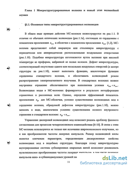 Глава 1 посвящена обзору литературы о последних достижениях в области оптики микроструктурированных и фотонокристаллических волокон. Будет дано описание основных линейных и нелинейно-оптических свойств микроструктурированных и фотоннокристаллических волокон. Будет дана классификация микроструктурированных волокон по принципу обеспечения волноводного режима в сердцевине волокна, оптическим свойствам, а также возможным применениям волокон нового типа в оптических и спектроскопических приложениях. Также будут описаны основные оптические и нелинейно-оптические эффекты, наблюдаемые в микроструктурированных волноводах, и оказывающих существенное влияние на их свойства и направления возможного применения. Будут кратко обсуждены основные пути теоретического анализа дисперсионных свойств МС-волокон.
