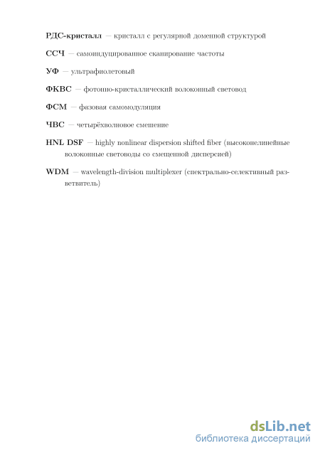Преобразование в длинноволновую область возможно за счёт процесса вынужденного комбинационного рассеяния (ВКР) в пассивном световоде (см., например, []), а в коротковолновую область - как за счёт генерации гармоник в нелинейных кристаллах, так и параметрического преобразования в процессе четырёхволнового смешения (ЧВС) непосредственно в волоконном световоде. Как и в случае нелинейных кристаллов волоконные оптические параметрические генераторы (ВОПГ) позволяют получать перестраиваемое излучение (см., например, []). Для параметрического преобразования излучения зачастую используется вырожденный по частоте накачки сир процесс ЧВС, при котором два фотона накачки за счет нелинейности х генерируют два новых фотона. Частота одного из них сир — Q (стоксова волна) меньше, а второго ujp + Q (антистоксова волна) больше частоты накачки, здесь Q - частотная параметрическая отстройка. Непрерывные ВОПГ разрабатывались в области малых оптических потерь волоконных световодов (1,5 мкм). Достигнутые параметрические отстройки (~ 15 ТГц) [] сравнимы со стоксовым сдвигом в ВКР-лазерах (13ТГц). Параметрическое преобразование в коротковолновую область (менее 1 мкм) в непрерывном режиме осуществлялось только во внерезонаторной схеме.
