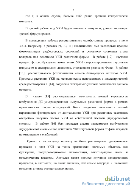 применимости теории возмущений. Были получены зависимости полной вероятности фотопроцесса от длительности УКИ при различных частотных отстройках несущих частот УКИ от собственной частоты двухуровневой системы. В работе [16] был проведен анализ зависимости возбуждения двухуровневой системы под действием УКИ гауссовой формы от фазы несущей по отношению к огибающей. Однако к настоящему моменту не были рассмотрены однофотонные процессы в поле УКИ на таких практически значимых объектах, как фуллерены, полупроводниковые наночастицы, многозарядные ионы и металлические кластеры. Актуален также процесс изучения двухфотонных процессов, в частности, на таких мишенях, как атомы водорода и щелочных металлов, а также отрицательных ионах.