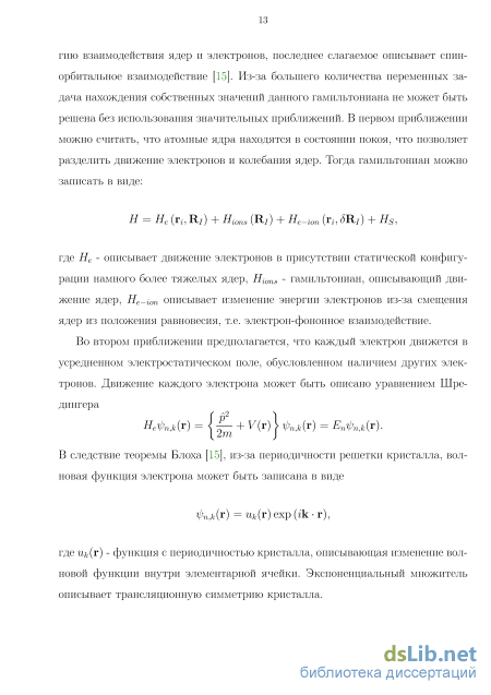 Электронные состояния идеального кристалла являются собственными значениями следующего гамильтониана: где г І и R/ - радиус векторы электронов и ядер, Zj - заряд ядра, а слагаемые описывают кинетическую энергию электронов и ядер, потенциальную энер 13 гию взаимодействия ядер и электронов, последнее слагаемое описывает спин-орбитальное взаимодействие [15]. Из-за большего количества переменных задача нахождения собственных значений данного гамильтониана не может быть решена без использования значительных приближений. В первом приближении можно считать, что атомные ядра находятся в состоянии покоя, что позволяет разделить движение электронов и колебания ядер. Тогда гамильтониан можно записать в виде: Н = Не (i"j, R/) + Hions (R-/) + He-ion (гь (5R/-) + Hs, где He - описывает движение электронов в присутствии статической конфигурации намного более тяжелых ядер, Hions - гамильтониан, описывающий движение ядер, He_ion описывает изменение энергии электронов из-за смещения ядер из положения равновесия, т.е. электрон-фононное взаимодействие.