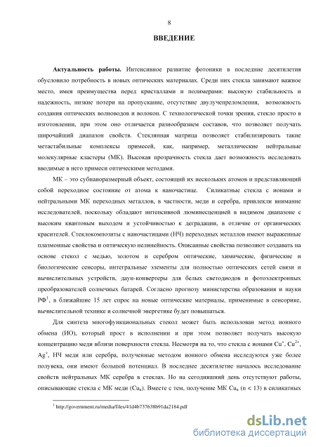 Актуальность работы. Интенсивное развитие фотоники в последние десятилетия обусловило потребность в новых оптических материалах. Среди них стекла занимают важное место, имея преимущества перед кристаллами и полимерами: высокую стабильность и надежность, низкие потери на пропускание, отсутствие двулучепреломления, возможность создания оптических волноводов и волокон. С технологической точки зрения, стекло просто в изготовлении, при этом оно отличается разнообразием составов, что позволяет получать широчайший диапазон свойств. Стеклянная матрица позволяет стабилизировать такие метастабильные комплексы примесей, как, например, металлические нейтральные молекулярные кластеры (МК). Высокая прозрачность стекла дает возможность исследовать вводимые в него примеси оптическими методами.