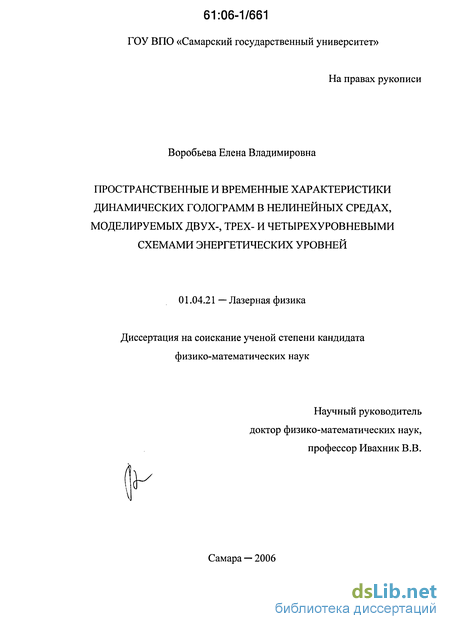 Апробация работы. Основные результаты работы докладывались и обсуждались на Всероссийской молодежной научной школе «Когерентная оптика и оптическая спектроскопия» (Казань, 2001, 2002); Международной конференции «Лазерная физика и применения лазеров» (Минск, 2003); III Международной конференции молодых уче ных и специалистов «Оптика-2003» (Санкт-Петербург, 2003); II Международной научно-технической конференции «Физика и технические приложения волновых процессов» (Самара, 2003); III Международной научно-технической конференции «Физика и технические приложения волновых процессов» (Волгоград, 2004); конференции «Концепции симметрии и фундаментальных полей в квантовой физике XXI века» (Самара, 2005), конференции «Проблемы фундаментальной физики XXI века» (Самара, 2005).