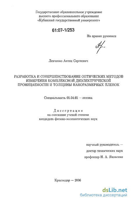 Приведенные в диссертации исследования применены на практике для измерения комплексной диэлектрической проницаемости и толщины, а так же отражательных параметров наноразмерных немагнитных плёнок, в том числе для измерения характеристик старения металлических плёнок (для определения скорости образования оксидных плёнок на поверхности металлов и их параметров: комплексной диэлектрической проницаемости и толщины). Работа выполнялась в рамках научно исследовательских работ Кубанского госуниверситета на кафедре оптоэлектроники в период с 2002 по 2006 гг. по теме «Исследование и разработка новых физико технологических принципов построения, микро нанооптических устройств сбора, обработки и передачи информации и перспективных сред для микролазеров», а также согласно гранту 2004 г. Федерального агентства по образованию по теме «Разработка методики измерения удельной проводимости тонких плёнок в сантиметровом и миллиметровом диапазоне» рег.№А04-3.20-203. Защищаемые положения. 1. Новый квазиоптический метод измерения комплексной диэлектрической проницаемости и (или) толщины в сверхвысокочастотном диапазоне длин волн тонких наноразмерных плоских плёнок из немагнитного проводящего материала или из немагнитного высокоимпедансного материала, основанный на спектральной закономерности коэффициента прохождения электромагнитной волны через квазиоптический резонатор одно из зеркал которого образовано исследуемой плёнкой; его математическое обоснование и определение границ применимости путём численного моделирования. 2. Методика измерения и алгоритм вычисления в видимом диапазоне длин волн неоднородности распределения (по поверхности) комплексной диэлектрической проницаемости и толщины наноразмерных металлических пленок; результаты численного исследования их применимости и эффективности по рассматриваемой физико-математической модели, основанной на угловой зависимости эффективности возбуждения ПЭВ (в геометрии Креч-мана) выше указанных параметров наноразмерных металлических плёнок. 3. Математические соотношения между величинами комплексной ди электрической проницаемости, толщины и оптическими параметрами, характеризующими тонкую паноразмерную плёнку и параметрами квазиоптической резонансной системы их измерения. 4. Алгоритмы численного решения задачи определения удельной проводимости и толщины наноразмерных плёнок на основе соотношений между величинами комплексной диэлектрической проницаемости, толщины и параметрами квазиоптической резонансной системы. 5. Схемы и устройства для осуществления разработанных оптических методов измерения комплексной диэлектрической проницаемости и толщины наноразмерных металлических плёнок в СВЧ диапазоне длин волн и неоднородности распределения этих параметров по поверхности в видимом диапазоне длин волн.