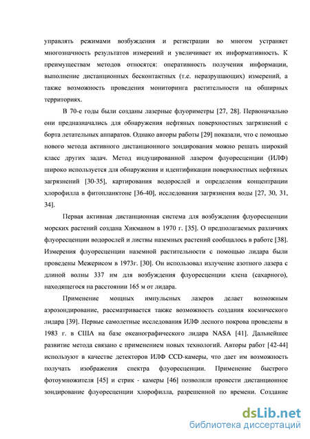 Использование флуоресценции хлорофилла для определения концентрации пигментов наталкивается на значительные трудности. Возбуждение флуоресцирующей формы Хл а может осуществляться как путм поглощения света самой этой формой, так и путм миграции энергии на не от менее агрегированных форм хлорофилла и от других пигментов, входящих в состав исследуемого объекта (каротиноидов, фикобилинов, фукоксантинов и др.) [48]. При этом интерпретация результатов и проведение количественного анализа (математическое описание исследуемых процессов) значительно усложняется. В связи с этим при разработке метода количественного анализа целесообразно использовать следующий подход. На первом этапе параллельно со снятием флуоресцентных характеристик проводится подробный биологический анализ объекта, в частности определяется концентрация и состав входящих в него пигментов. На втором этапе проводится корреляционный анализ этих двух массивов данных и получение эмпирических выражений, связывающих интенсивность флуоресценции с соответствующими концентрациями.