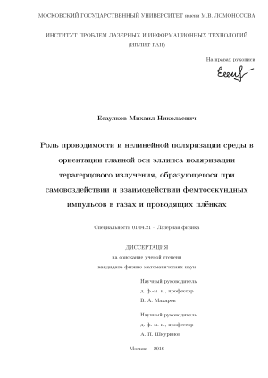 Ориентация эллипса поляризации терагерцового излучения, возникающего при самовоздействии и взаимодействии фемтосекундных импульсов титан-сапфирового лазера с газово-плазменными средами и проводящими плёнками, определяется взаимным соотношением проводимости и нелинейной поляризации этих сред.