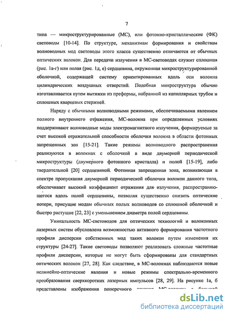 Создание МС-волокон, отличающихся от стандартных световодов по своей архитектуре, свойствам, а также принципам реализации волноводного распространения, стало одним из наиболее выдающихся достижений в области оптических технологий за последнее время. Анализ спектрально-временных преобразований сверхкоротких лазерных импульсов, а также исследование дисперсионных и нелинейно-оптических свойств МС-волокон, которым посвящена настоящая диссертационная работа, необходимы для разработки уникальных волоконно-оптических систем, обеспечивающих высокоэффективную управляемую трансформацию световых импульсов с начальными длительностями от десятков наносекунд до нескольких циклов светового поля (единицы фемтосекунд) в широком диапазоне пиковых мощностей от сотен ватт до нескольких гигаватт.