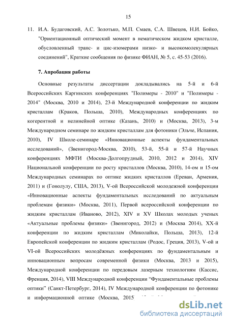 Основные результаты диссертации докладывались на 3-м Международном семинаре по жидким кристаллам для фотоники (Эльче, Испания, 2010), XIII, XIV и XV Школах молодых ученых «Актуальные проблемы физики» (Звенигород, 2010 и 2012) и (Москва 2014), 53-й, 55-й и 57-й Научных конференциях МФТИ (Москва-Долгопрудный, 2010, 2012 и 2014), XIV Национальной конференции по росту кристаллов (Москва, 2010), 14-ом и 15-ом Международных семинарах по оптике жидких кристаллов (Ереван, Армения, 2011) и (Гонолулу, США, 2013), V-ой Всероссийской молодежной конференции «Инновационные аспекты фундаментальных исследований по актуальным проблемам физики» (Москва, 2011), Первой всероссийской конференции по жидким кристаллам (Иваново, 2012), Международной конференции по когерентной и нелинейной оптике (Москва, 2013), ХХ-й конференции по жидким кристаллам (Миколайки, Польша, 2013), 12-й Европейской конференции по жидким кристаллам (Родос, Греция, 2013), V-ой и VI-ой Всероссийских молодёжных конференциях по фундаментальным и инновационным вопросам современной физики (Москва, 2013 и 2015), 6-й Всероссийской Каргинской конференции "Полимеры - 2014" (Москва, 2014), Международной конференции по передовым лазерным технологиям (Кас-сис, Франция, 2014), VIII Международной конференции “Фундаментальные проблемы оптики” (Санкт-Петербург, 2014), IV Международной конференции по фотонике и информационной оптике (Москва, 2015), 13-ой Международной научно-технической конференции «Оптические методы исследования потоков» (Москва, 2015), Международной конференции молодых ученых и специалистов «Оптика-2015» (Санкт-Петербург, 2015), XXIII Международной конференции студентов, аспирантов и молодых ученых по фундаментальным наукам (МГУ, Москва, 2016).