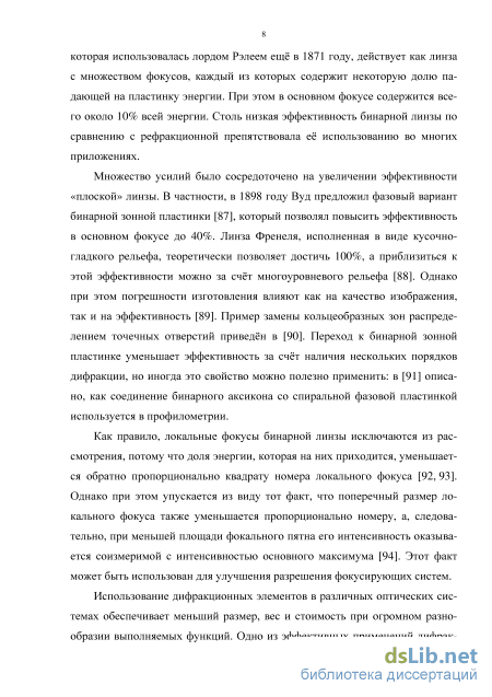 В первой главе будет рассмотрен геометро-оптический анализ асферической линзы с поверхностью, описываемой степенной функцией. Хотя этот результат нельзя непосредственно переносить на действие ДОЭ, геометро-оптическое рассмотрение позволяет предсказать качественное поведение элементов, причём независимо от наличия параксиальности. Например, безаберрационная линза получается одинаковой и при геометро-оптическом рассмотрении, и в непараксиальной волновой теории. Естественно, что для получения количественных результатов необходимо рассмотрение в рамках волновой теории, аналитически выражаемой интегральной формулой Рэлея-Зоммерфельда. Если не оговорено особо, используется скалярный вариант нахождения амплитуды электромагнитного поля.