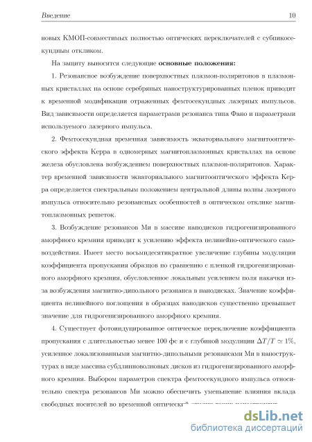 Другим фактором, требующим пристального внимания является время отклика таких систем: характерное время за которое устройство способно переключать свое состояние. Временная динамика полупроводников, в том числе и кремния, исследовалась уже достаточно давно, в основном с использованием методики“на-качка” – “зондирование” [114–119]. Время релаксации фотоиндуцированных свободных носителей в кремнии варьируется в диапазоне времен от нескольких пи-косекунд до микросекунд. Одним из вариантом сокращения времени релаксации свободных носителей является использование резонаторов. Было показано,что в фотонно-кристаллических переключателях минимальное время релаксации не ограничено временем релаксации свободных носителей в кремнии [120, 121].Ко-гда отверстие в фотонном кристалле становится очень маленьким, то диффузия свободных носителей из него существенно ускоряет процесс релаксации. В результате, характерное время отклика такой системы равняется десяткам пикосекунд. В других системах, например, в виде кольцевых резонаторов, характерное время отклика также варьируется в этом диапазоне [102–104]. Следовательно, до сих пор в системах, где основным материалом является кремний, не было достигуто фемтосекундное время отклика. Оно может быть получено,например , с использованием возбуждения поверхностных плазмон-поляритонов.Причем , так как используются наноструктурированные поверхности тонких пленок, металлические наночастицы или нановолокна, то такие системы могут быть интегрированы в чип. Минусом оптических переключателей на основе возбуждения ПП является то, что активный компонент — это металл. В таких системах достаточно большие омические потери, что не позволяет использовать большие мощности оптического излучения. Поэтому интересует возможность отказаться от плазмонных металлов, но получить сравнимые времена отклика в оптическом диапазоне излучения. Это возможно, если использовать диэлектрические частицы с высоким показателем преломления[122].