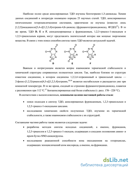 ТДО, аннелированные пятичленными гетероциклами, на сегодняшний день практически не изучены (известен лишь [1,2,5]оксадиазоло[3,4-е][1,2,3,4]тетразин-4,6-диоксид). В то же время ТДО, сконденсированные с фуроксановым, 1,2,3-триазольным и 1,2,3-триазол-1-оксидным ядрами, могут представлять значительный интерес как мощные энергоемкие вещества. В связи с этим разработка способов синтеза этих ТДО является актуальной задачей.