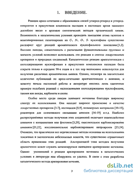 Особое место среди амидов занимают мочевины благодаря широкому спектру их использования. Они находят широкое применение в качестве лекарственных препаратов [3-7], пестицидов [8,9], полимерных материалов [10-15], рецепторов для селективного связывания анионов [16-19] и.т.д. Наиболее распространённые методы получения этих соединений включают взаимодействие анилинов с изоцианатами или фосгеном [3,20], окислительное карбонилирование анилинов [21,22], восстановительное карбонилирование нитроаренов [23,24]. Очевидно, что практически все перечисленные методы основаны на использовании токсичных и экологически небезопасных веществ, что существенно ограничивает область применения этих реакций. Альтернативой этим методам получения арилмочевин может служить катализируемое палладием арилирование мочевины. Однако упоминаний о реакции арилирования мочевины в каталитических условиях в литературе нам обнаружить не удалось. В связи с этим разработка каталитического метода арилирования мочевин, безусловно, является актуальной.