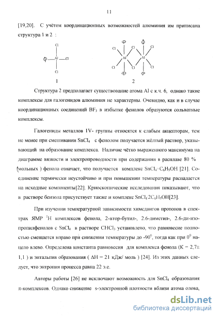С VC1з пирокатехин образует комплекс 1:1 [32], а с А1С1з многоатомные фенолы: пирокатехин, резорцин и пирогаллол дают как комплексы 1:1, так и 1:2 [19]. Для комплексов 1:2 существует возможность как связывания обеих гидро-ксильных групп с галогенидом алюминия, так и координация последнего в виде димера с одним из атомов кислорода. Выбор между этими двумя вариантами координации сделать пока не представляется возможным.