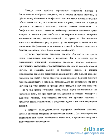 Прежде всего проблема перекисного окисления липидов в биологических мембранах находится, как и вообще биология мембран, на рубеже между биохимией и биофизикой. Биохимические методы выделения субклеточных частиц, энзимологического контроля, равно как и анализа продуктов перекисного окисления, находят важное дополнение - в биофизических методах изучения свободно-радикальных процессов, среди которых в данном случае наиболее плодотворным оказалось измерение хемилюминесценции, сопровождающей эти процессы. Биохимическая концепция метаболизма, регулируемого рядом факторов, включая энзимы, дополняется биофизическими категориями реакций свободных радикалов в бимолекулярной структуре биологических мембран [6].
