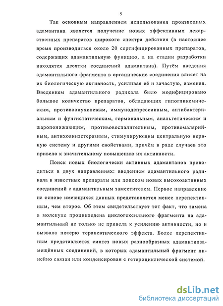 Поиск новых биологически активных адамантанов проводится в двух направлениях введением адамантильного радикала в известные препараты или поиском новых высокоактивных соединений с адамантильным заместителем Более перспективным представляется синтез новых разнообразных адамантилза-мещенных соединений, в которых адамантильный фрагмент линейно связан или конденсирован с гетероциклической системой
