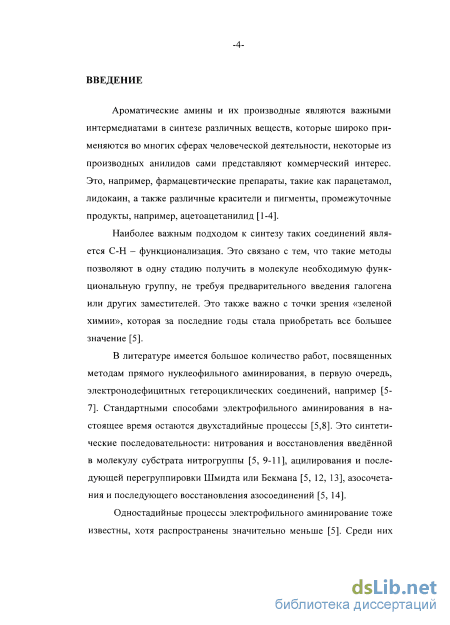 Таким образом, в настоящее время в литературе представлены как многостадийные методы введения аминогруппы в ароматическое кольцо, так и прямое аминирование (амидирование) ароматических соединений. Многостадийные методы, включающие стадии нитрования и восстановления, азосочетания и восстановления, ацилирования и реакции Шмидта, ацилирования и перегруппировки Бекмана, хорошо изучены как в теоретическом, так и препаративном плане. Можно ожидать, что дальнейший прогресс в этой области будет связан с введением в практику новых нитрующих агентов.