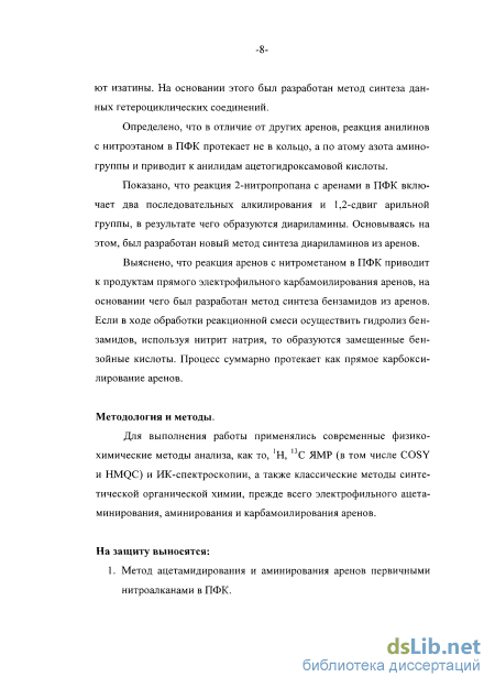 Цель работы: исследование поведения нитрометана, первичных и вторичных нитросоединений в реакциях с аренами в полифосфорной кислоте. Разработка методов прямого электрофильного аминирования, карбамоили- рования и аннелирования азотсодержащих гетероциклов на их основе. Задачи исследования.