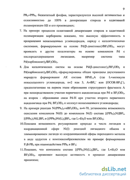 13.Показано, что превращение НБ в присутствии этилена под действием гидридных комплексов типа [HNi(PPh3)(L)2]BF3X приводит к синтезу макромономеров с концевой винильной группой, экспериментально подтверждающим вывод о формировании и функционировании координационно-ненасыщенных гидридных комплексов Ni(II) как АК в процессах ди-, олиго- полимеризации ненасыщенных углеводородов. Практическая значимость.
