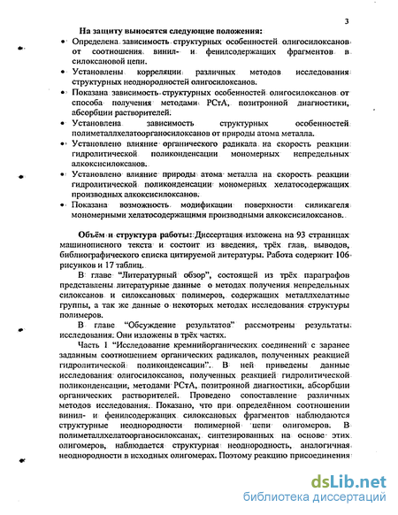 Часть 1 "Исследование кремнийорганических. соединений с заранее заданным соотношением органических радикалов, полученных реакцией гидролитической- поликонденсации".- В ней приведены данные исследования олигосилоксанов, полученных реакцией гидролитической поликонденсации, методами РСтА, позитроннои диагностики, абсорбции органических растворителей. Проведено сопоставление различных методов исследования;. Показано, что при определённом соотношении винил- и фен ил содержащих силоксановых фрагментов наблюдаются структурные неоднородности полимерной цепи олигомеров: В полиметаллхелатоорганосилоксанах, синтезированных на основе- этих олигомеров, наблюдается структурная; неоднородность, аналогичная: неоднородности в исходных олигомерах. Поэтому реакцию присоединения1