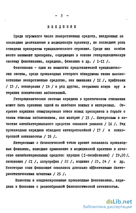 Среди огромного числа лекарственных средств, внедренных за последние десятилетия в медицинскую практику, не последняя роль отведена препаратам трициклического строения. Среди них особое место занимают препараты, содержащие в основе гетероциклическую систему фенотиазина, акридина, феназина и др. / І-ІІ /.
