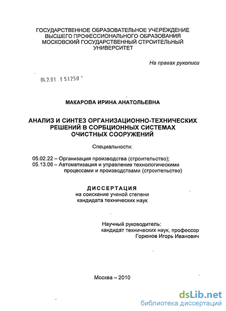Реализация результатов исследований. На основе полученных практических результатов для ЗАО «Энерготех» (бывшее ПКБ «Внедрение» Минтопэнерго РФ) подготовлены рекомендации по выбору структурных схем, способов и технических средств организационного управления сорбционной очистки природных, бытовых и производственных сточных вод. Эти же результаты используются в учебном процессе при подготовке инженеров на факультете Информационных систем, технологий и автоматизации в строительстве МГСУ.