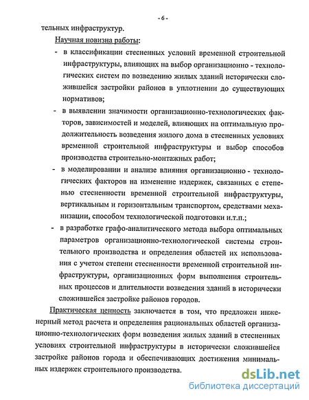 Объекты исследования. Организационно-технологические системы по возведению жилых домов в стесненных условиях временных строи тельных инфраструктур. Научная новизна работы: