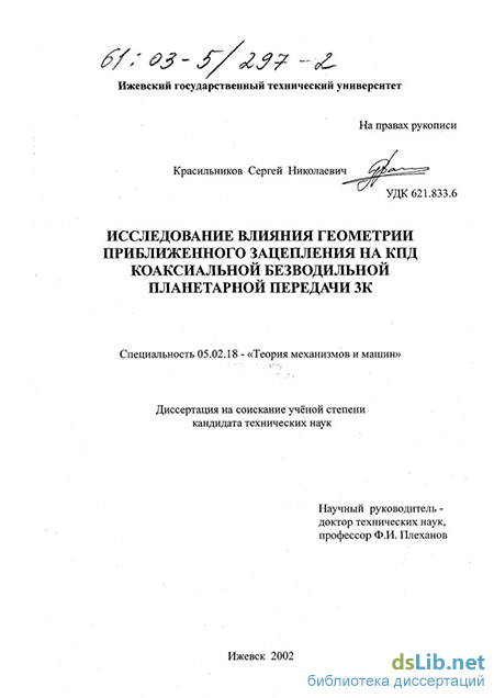 Красильников Сергей Николаевич. Исследование влияния геометрии приближенного зацепления на КПД коаксиальной безводильной планетарной передачи ЭК : диссертация ... кандидата технических наук : 05.02.18.- Ижевск, 2002.- 144 с.: ил. РГБ ОД, 61 03-5/297-2