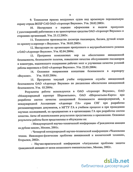 Результаты работы используются в ОАО «Аэропорт Внуково», ОАО «Международный аэропорт Шереметьево», ОАО «Шереметьево-Карго» при разработке систем качества авиационной безопасности авиапредприятий, в международной Ассоциации «Аэропорт ГА» стран СНГ при разработке регламентирующих документов, в МГТУ ГА в учебном процессе и при проведении научных исследований, на предприятиях и в организациях ГА при разработке систем качества. Акты об использовании результатов представлены в приложении. Основные результаты работы были представлены и обсуждены на: