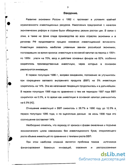 Развитие экономики России с 1992 г. протекает в условиях крайней ограниченности инвестиционных ресурсов. Накопления предприятий с началом экономических реформ в стране были обесценены резким ростом цен. В связи с этим, а также на фоне спада производства во всех отраслях экономики и в регионах РФ продолжается процесс снижения инвестиционной активности. Инвестиции оказались наиболее уязвимым звеном российской экономики, пострадавшим за время кризиса: инвестиции в основной капитал за период с 1991г. по 1995г. упали на 70%, ввод в действие основных фондов на 82%, особенно сократились производственные инвестиции, через которые в основном реализуются инновации.