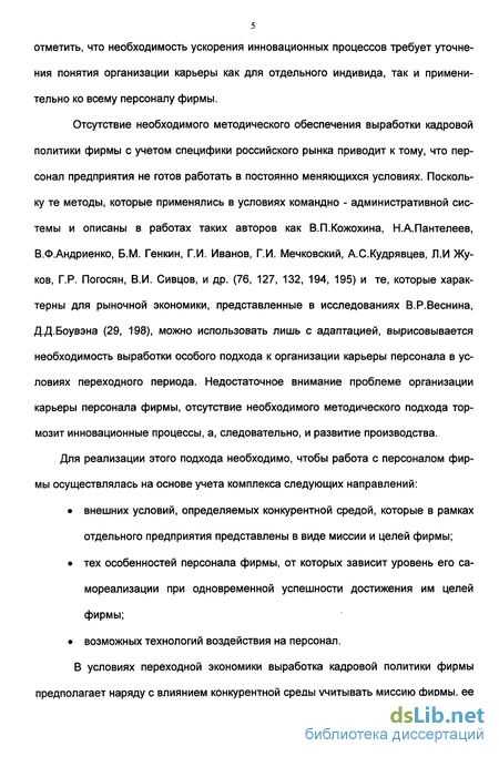 воздействовать на работников предприятия. Понятие карьеры, этапы ее планирования рассмотрены и определены в исследованиях таких специалистов по управлению персоналом как У.Брэддик, В.Р.Веснин, Е.В.Маслов, В.И.Шкатулла, Д.Боувэн и др. (16, 29, 98, 191, 198). Однако в научной литературе недостаточное внимание уделено изучению проблемы выработки кадровой политики фирмы, действующей в условиях постоянно меняющейся рыночной конъюнктуры. Чаще всего применяются методы логических рассуждений, на которые указано, в частности, в статье О.К.Платова (166), либо описываются лишь элементы процесса выработки и реализации политики управления персоналом предприятия (9), но этого оказывается недостаточно для практического осуществления организации карьеры в современных условиях.