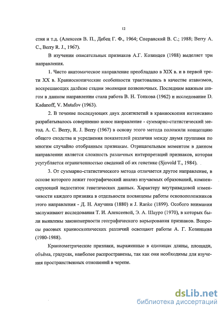 2. В течение последующих двух десятилетий в краниоскопии интенсивно разрабатывалось совершенно новое направление - суммарно-статистический метод. А. С. Berry, R. J. Berry (1967) в основу этого метода положили концепцию общего сходства и усреднения показателей различия между двумя группами по многим случайно отобранным признакам. Отрицательным моментом в данном направлении является сложность различных интерпретаций признаков, которая усугубляется ограниченностью сведений об их генетике (Sjovold Т., 1984). .