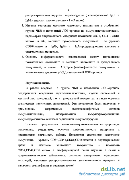 Впервые представлена клинико-иммунологическая интерпретация полученных результатов, оценена информативность материала и практическая значимость работы. Показатели системного клеточного иммунитета — уровень CD3+,CD4+,CD8+,CD16+ioieTOK в периферической крови и местного клеточного иммунитета — плотность CD3+,CD4+,CD8+ioieTOK в лимфаденоидной ткани изучены в связи с продолжительностью заболевания, степенью гиперплазии аденоидных вегетации, степенью распространенности воспалительного процесса и наличием эозинофилии в периферической крови и лимфаденоидной ткани.