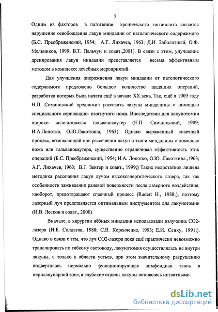 Вопросам лечения хронического тонзиллита посвящено большое количество научных работ (Б.С. Преображенский, 1954; И.А.Лопотко, О.Ю.Лакоткина, 1963; A.B. Змеев, 1988; А.И.Извин,1998; Д.И. Заболотный, О.Ф. Мельников, 1999; О.В. Андамова и соавт., 2001; В.Т. Пальчун и соавт.,2001; A.A. Шейхаметов, 2001; Халед Авад Эль Мехри, 2001; B.C.Дергачев,2001; Б.В. Шеврыгин и соавт.,2001; Ю.А. Лоцманов и соавт., 2001; М. Petrek, 1991;) Однако, несмотря на значительное многообразие существующих методов лечения, поиск новых, эффективных методов санации небных миндалин остается весьма актуальным.