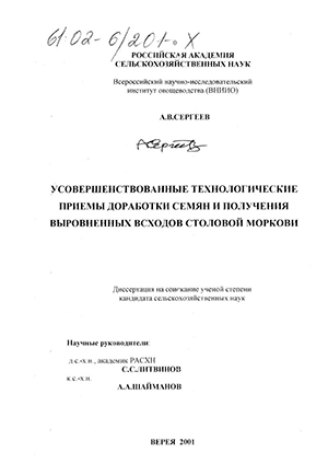 Сергеев Алексей Васильевич. Усовершенствованные технологические приемы доработки семян и получения выравненных всходов столовой моркови : диссертация ... кандидата сельскохозяйственных наук : 06.01.06.- Верея, 2001.- 104 с.: ил. РГБ ОД, 61 02-6/201-X