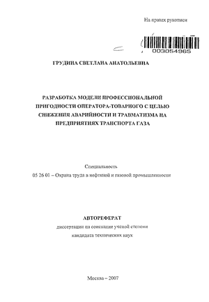 Цель работы состоит в снижении вероятности аварийности и травматизма на газотранспортных предприятиях на основе разработки модели профессиональной пригодности операторов-товарных (на примере Очаковской базы сжиженного газа)
