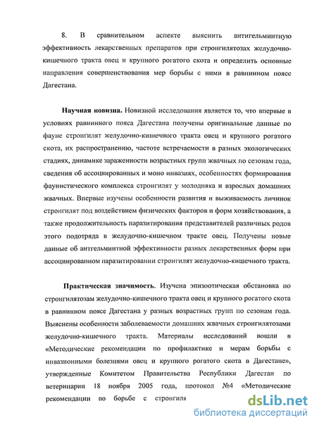 Научная новизна. Новизной исследования является то, что впервые в условиях равнинного пояса Дагестана получены оригинальные данные по фауне стронгилят желудочно-кишечного тракта овец и крупного рогатого скота, их распространению, частоте встречаемости в разных экологических стадиях, динамике зараженности возрастных групп жвачных по сезонам года, сведения об ассоциированных и моно инвазиях, особенностях формирования фаунистического комплекса стронгилят у молодняка и взрослых домашних жвачных. Впервые изучены особенности развития и выживаемость личинок стронгилят под воздействием физических факторов и форм хозяйствования, а также продолжительность паразитирования представителей различных родов этого подотряда в желудочно-кишечном тракте овец. Получены новые данные об антгельминтной эффективности разных лекарственных форм при ассоциированном паразитировании стронгилят желудочно-кишечного тракта.