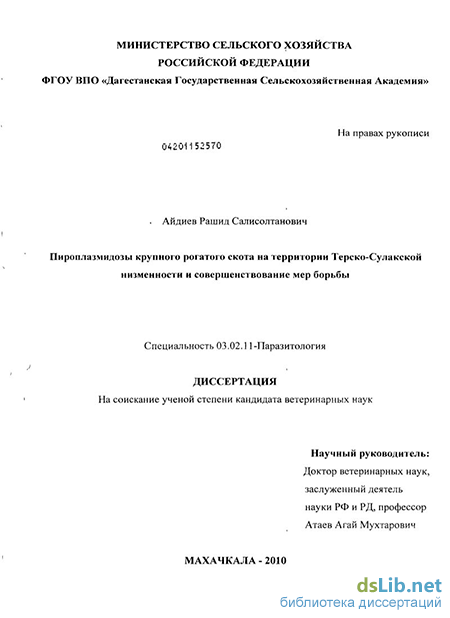 Диссертационная работа выполнялась под научным руководством доктора ветеринарных наук, заслуженного деятеля науки РФ и РД, профессора Атаева Агая Мухтаровича, который оказывал научно-методическую помощь при проведении исследований, анализе полученных данных.