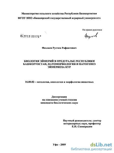 Цели и задачи исследований. Целями работы являются изучение распространения эймериоза кур и особенностей биологии эймерий в природно-климатических условиях Предуралья Башкортостана, описание патоморфологических изменений при эймериозе кур и выяснение этиопатогенеза этого заболевания.