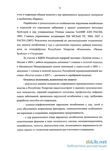 Научная новизна. Впервые проведен клинико-морфологический анализ и обобщение материалов комплексных исследований по нарушению обмена веществ у сельскохозяйственных, диких, экзотических и декоративных птиц. Установлены возрастные особенности развития незаразной патологии у бройлеров и цыплят ремонтного поголовья. Выяснены наиболее распространенные нозологические формы нарушения метаболизма у кур родительского стада в виде мочекислого диатеза, сальпингоперитонита, каннибализма, нарушения опорно-двигательного аппарата и гепатозов, имеющих разную сте-