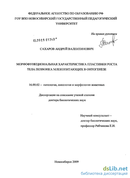 Актуальность темы. Осевой скелет позвоночных всех классов закладывается в принципиально одинаковом виде, и принципиальное сходство его строения сохраняется во взрослом состоянии (Smitt H., 2004; Gilberg G. 2005). Однако развитие каждого из структурных элементов осевого скелета на общем фоне тесной структурной взаимосвязи под влиянием формообразующих факторов и генетического контроля происходит относительно самостоятельно (Carrol F., 2000; Серов О.Л., 2006). Морфогенетические закономерности развития осевого скелета у различных видов млекопитающих, включая человека, изучены недостаточно. В первую очередь это касается хрящевой пластинки роста тела позвонка, функциональная активность клеток которой определяет рост позвоночного столба (Glorieux F.H., 2000; Malemud C.J., 2007). Данные о возрастных особенностях формирования пластинки роста человека и животных необходимы для понимания патогенеза аномалий и пороков развития позвоночного столба, как врожденных, так и возникающих, в постнатальном периоде онтогенеза.